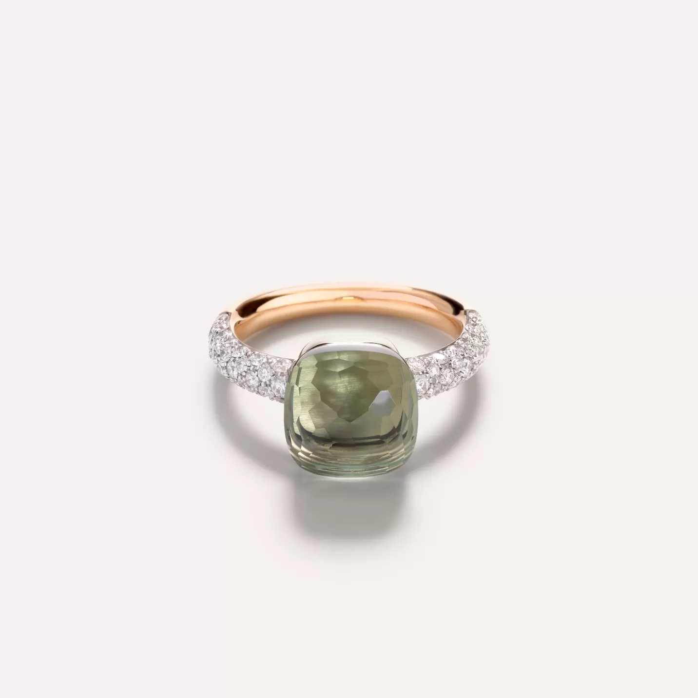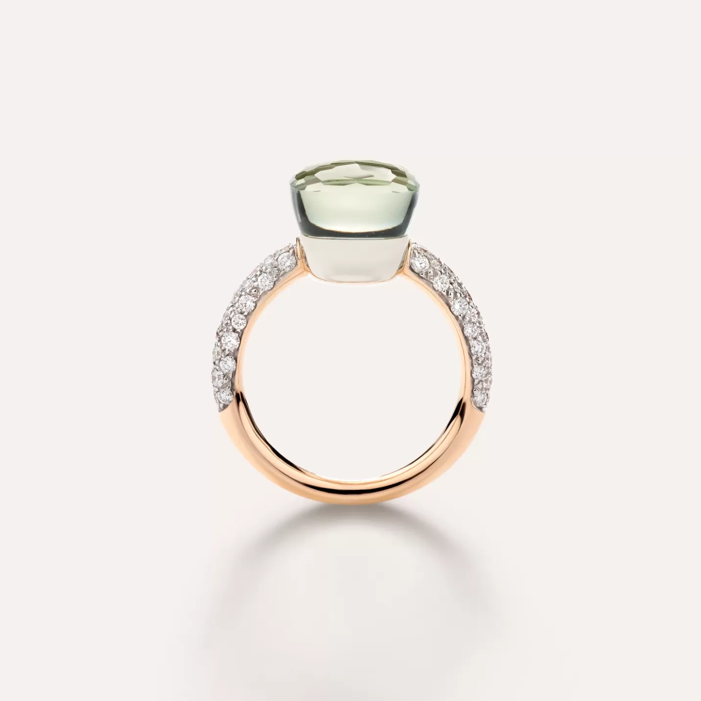 Anello in oro rosa e bianco 18K con 1 prasiolite (≈7 ct) e 58 diamanti bianchi (≈0.7 ct) su oro rosa 18K rodiato bianco.