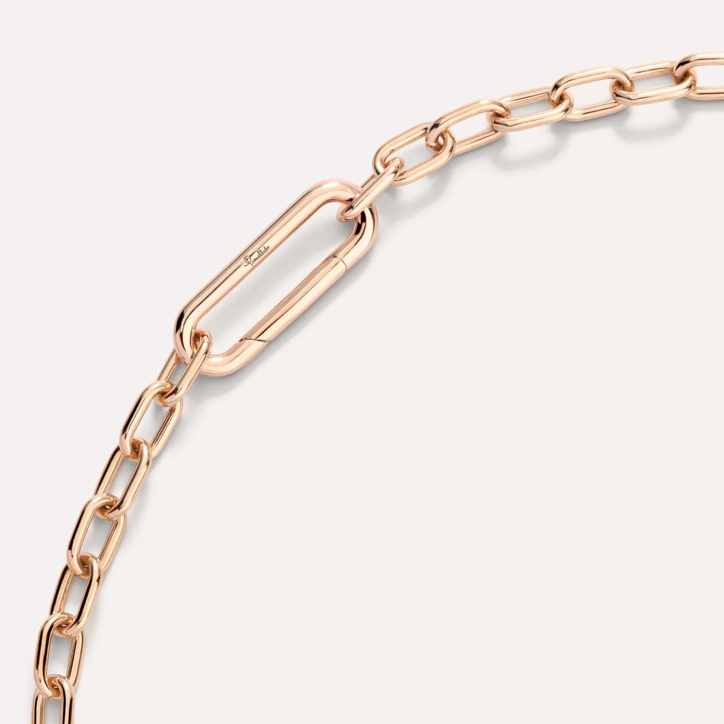 La collana a catena in oro rosa è chiusa da un fermaglio a scatto celato nell’inconfondibile maglia oversize che è il …
