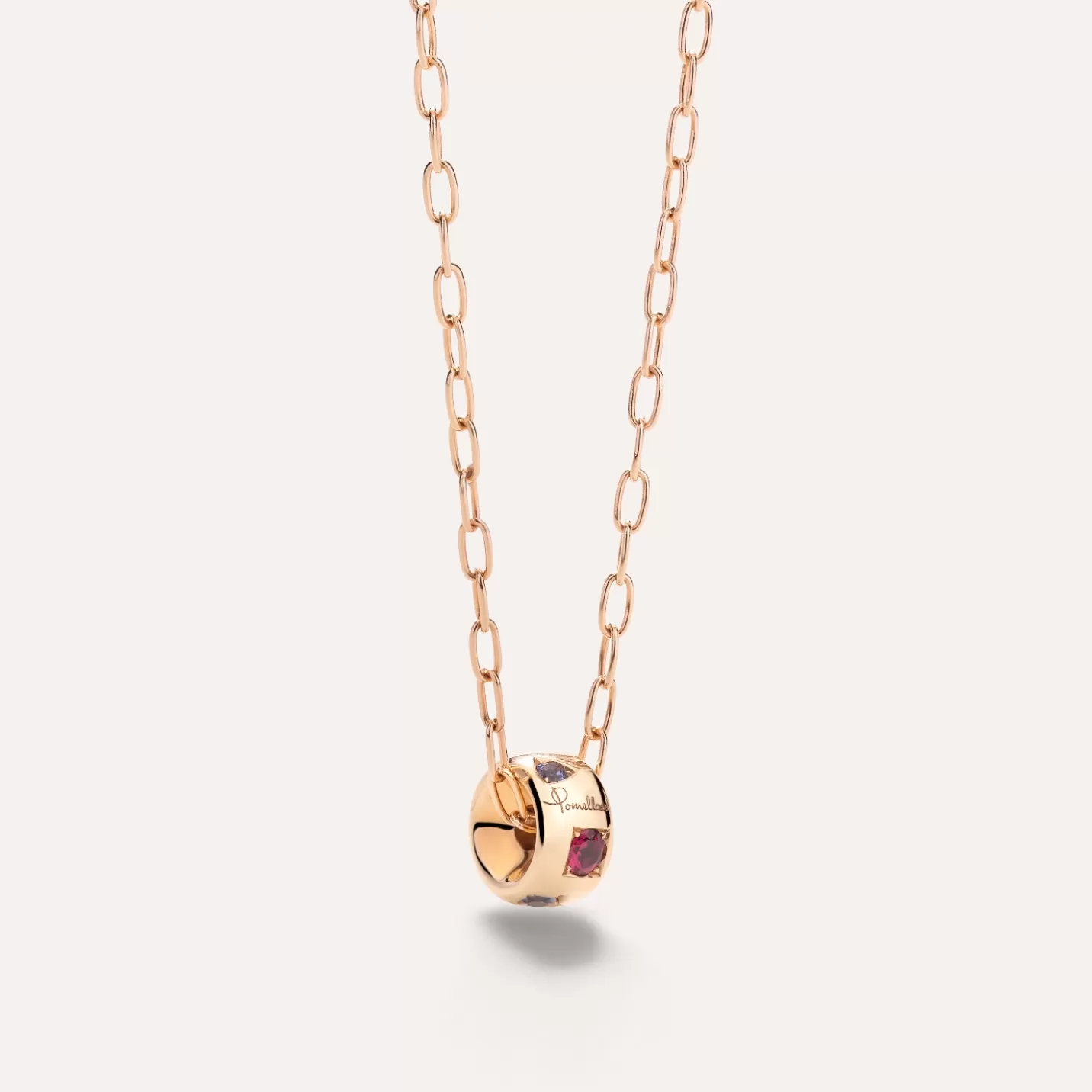 Collana con pendente in oro rosa 18K e 1 zaffiro orange trattato (≈0.1 ct), 1 zaffiro blu (≈0.1 ct), 1 zaffiro rosa (≈0.1 ct), 1 tsavorite (≈0.1 ct), 1 spinello rosso (≈0.1 ct) e 1 tanzanite (≈0.1 ct).