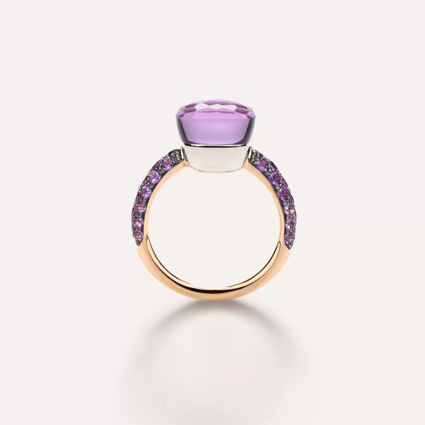 Anello in oro rosa e bianco 18K con 1 ametista, 1 giada (≈7.3 ct) e 38 ametiste (≈0.8 ct) su oro rosa 18K rodiato nero.